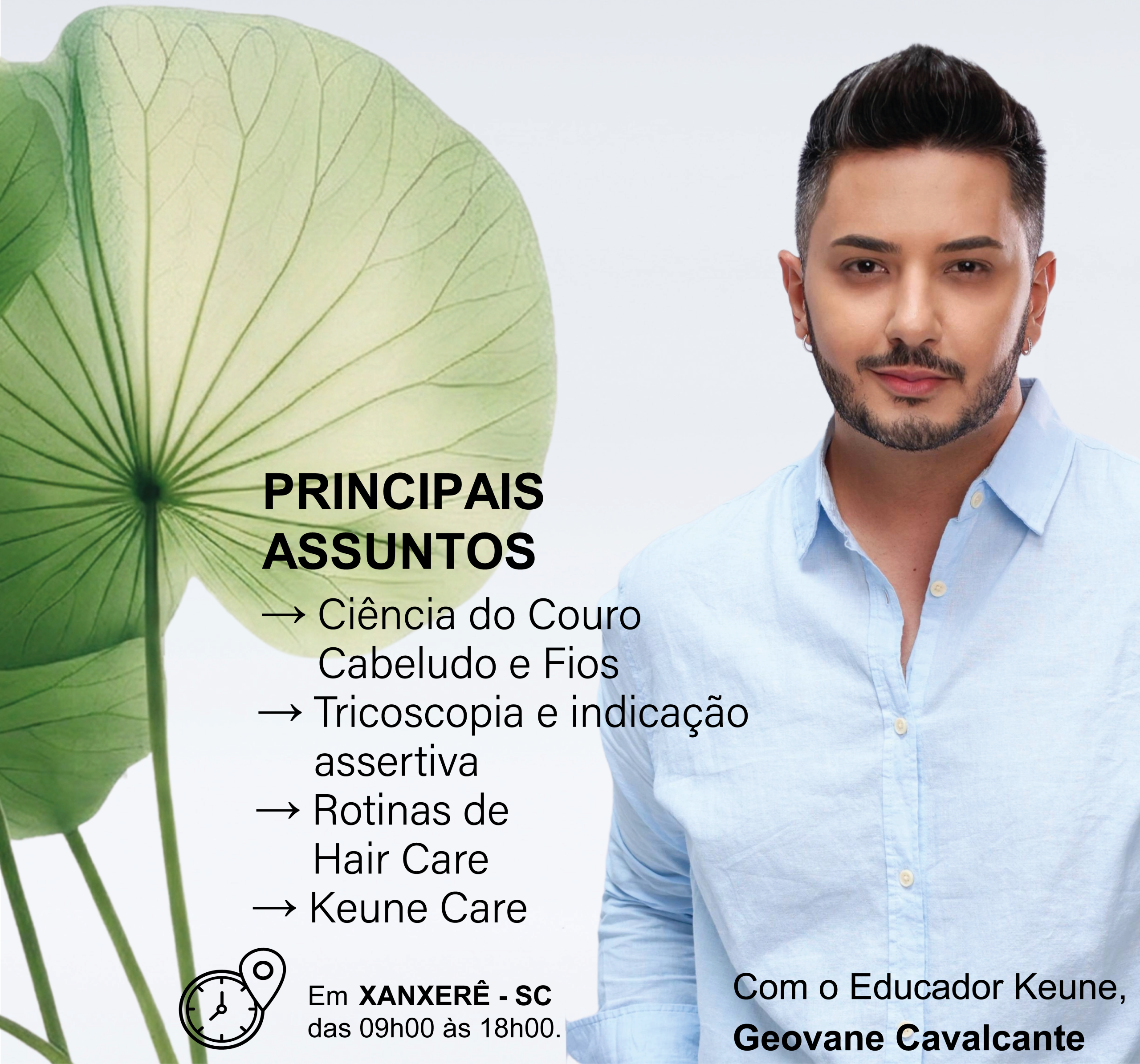 E para conduzir essa imersão, você estará com Geovane Cavalcante — Educador Keune, terapeuta capilar e membro da Associação Brasileira de Terapia Capilar. Um profissional que vive, estuda e aplica na prática tudo o que ensina, trazendo uma visão real, atual e transformadora para o seu dia a dia.